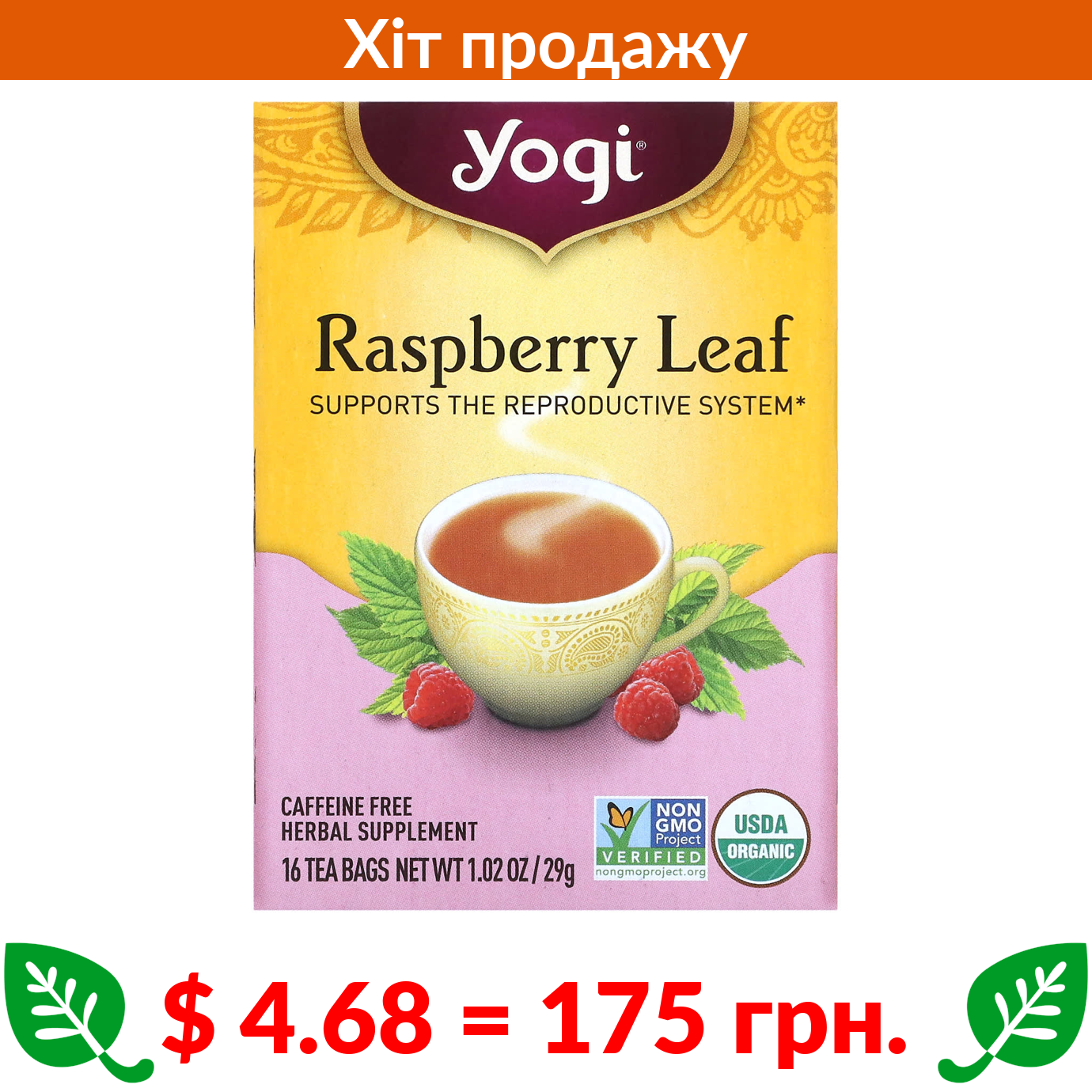 $ 4.68 = 175 грн. Yogi Tea, листя малини для жінок, без кофеїну, 16 чайних пакетиків, 29 г (1,02 унції)