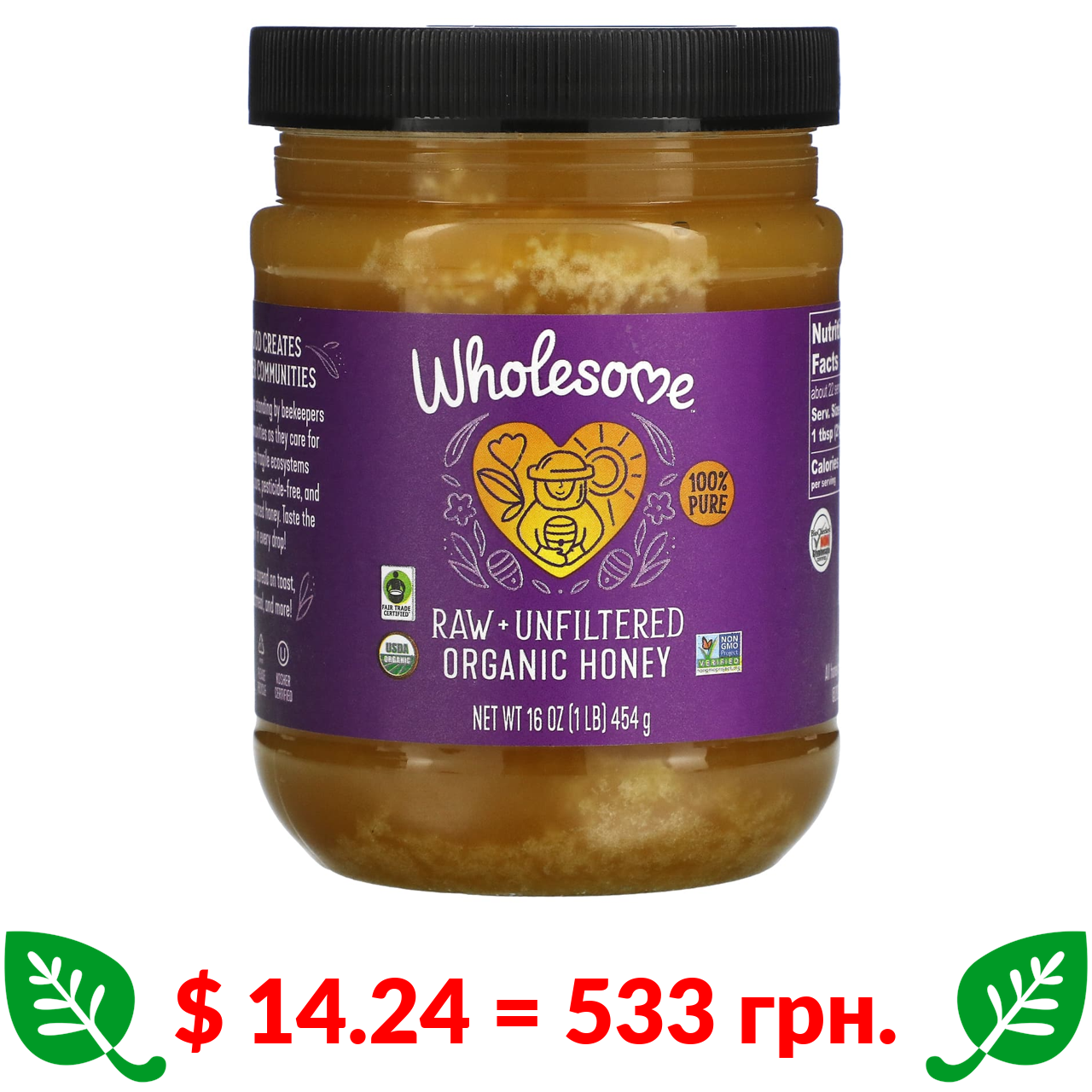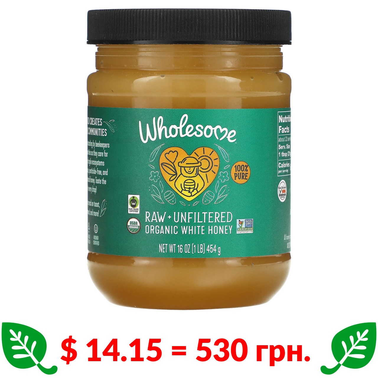 $ 14.15 = 530 грн. Wholesome, органічний білий мед, необроблений і нефільтрований, 454 г (16 унцій)