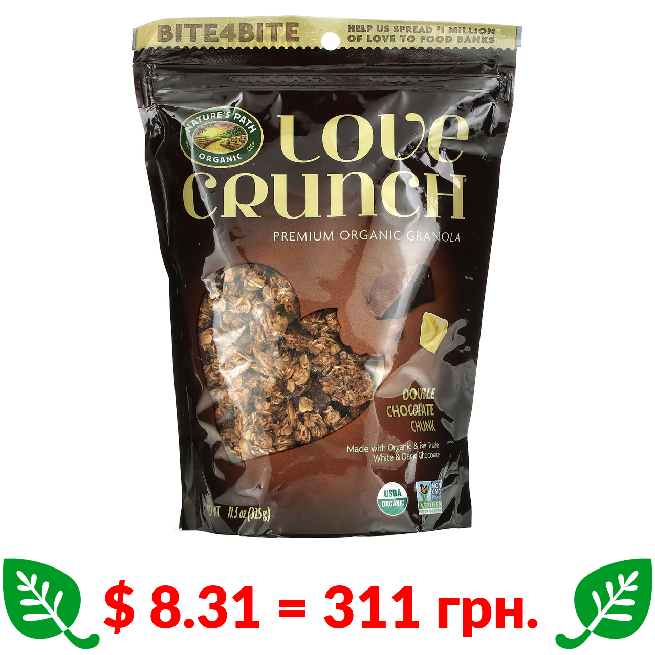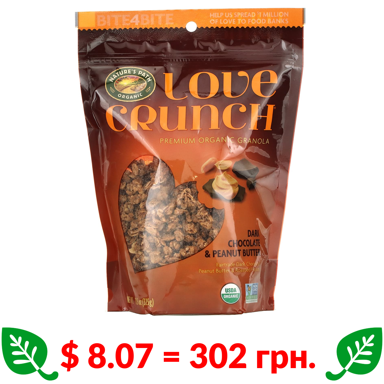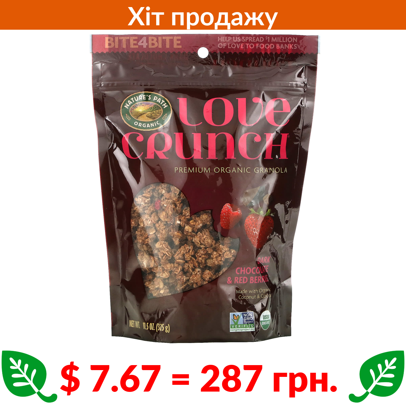 $ 7.67 = 287 грн. Nature’s Path, Love Crunch, органічна гранола преміальної якості, темний шоколад і червоні ягоди, 325 г (11,5 унції)
