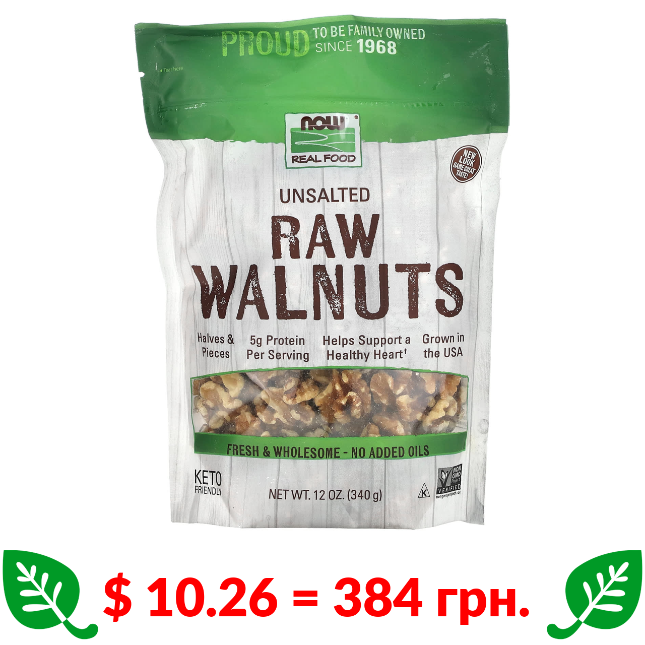 $ 10.26 = 384 грн. Now Foods, Real Food, сирі волоські горіхи, несолоні, 12 унцій (340 г)