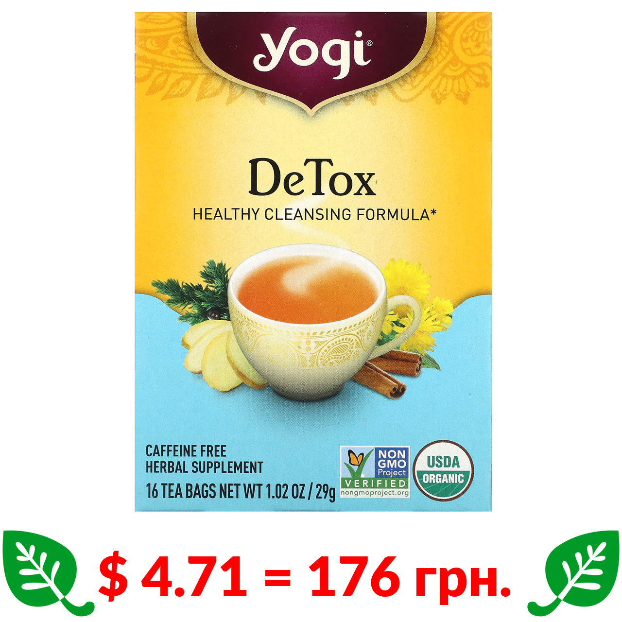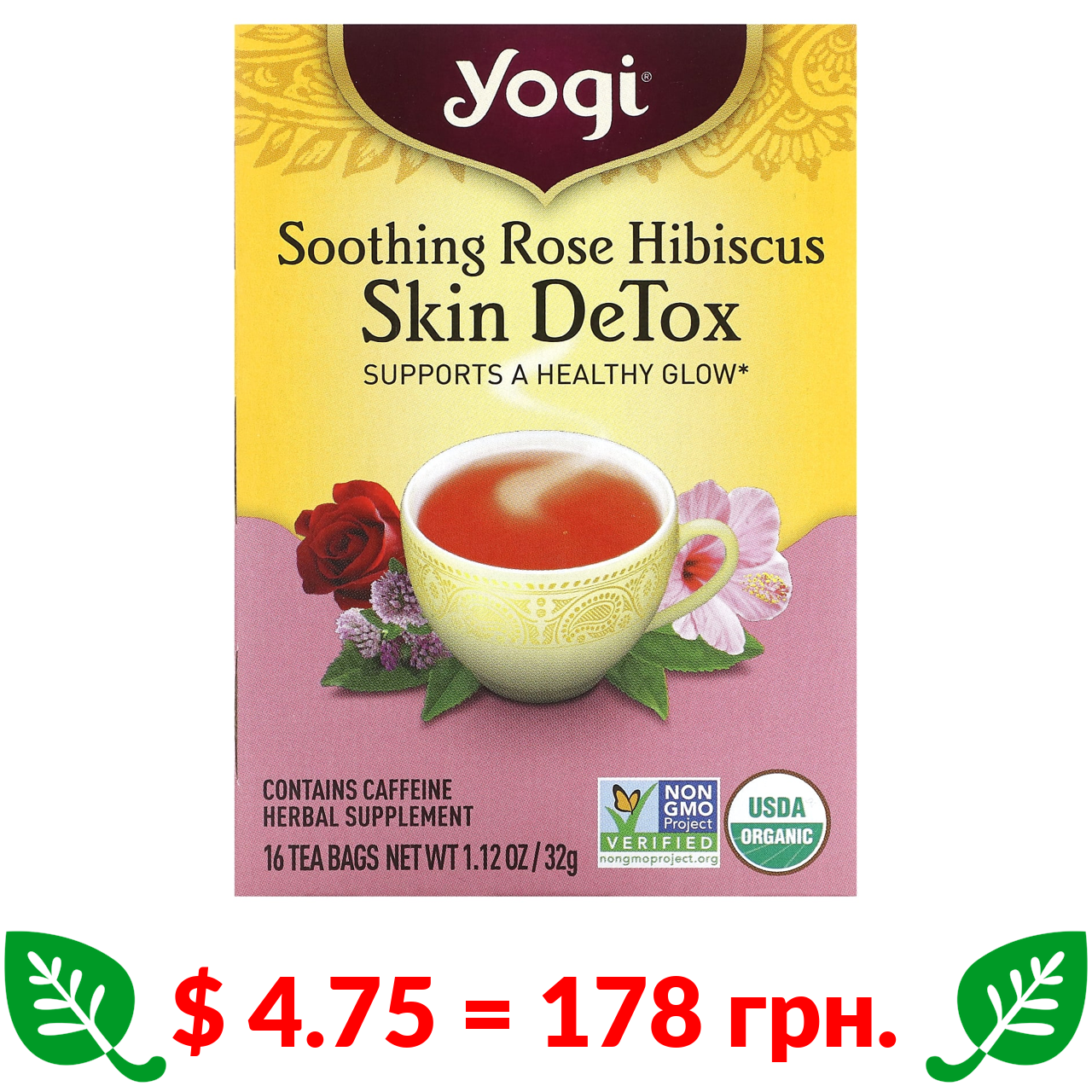 $ 4.75 = 178 грн. Yogi Tea, Skin DeTox, заспокійливий чай з трояндою і гібіскусом, 16 чайних пакетиків, 32 г (1,12 унції)