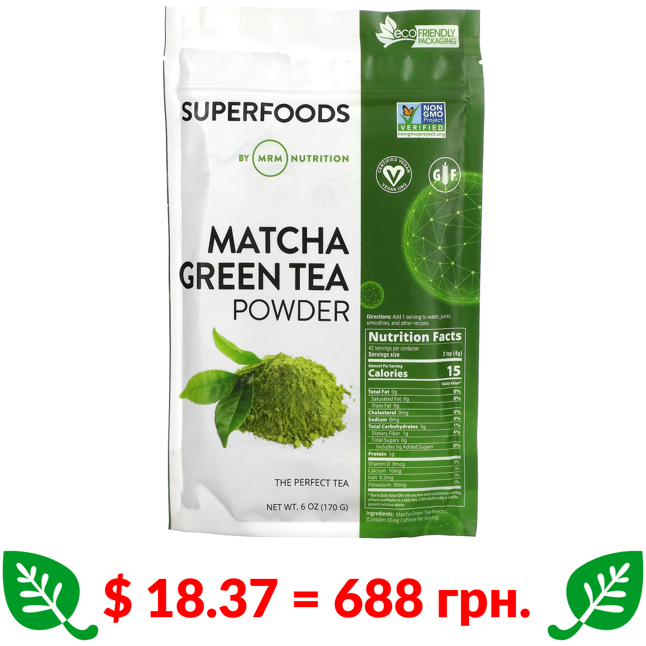 $ 18.37 = 688 грн. MRM Nutrition, зелений чай матча в порошку, 170 г (6 унцій)