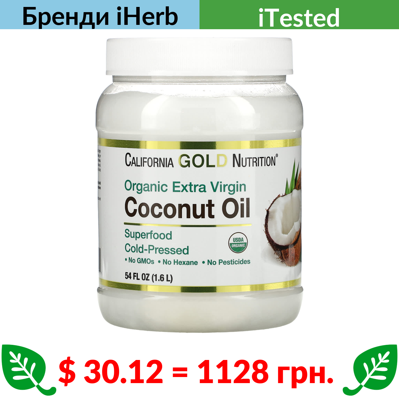 $ 30.12 = 1128 грн. California Gold Nutrition, органічна кокосова олія першого холодного віджиму, 1,6 л (54 рідк. унції)