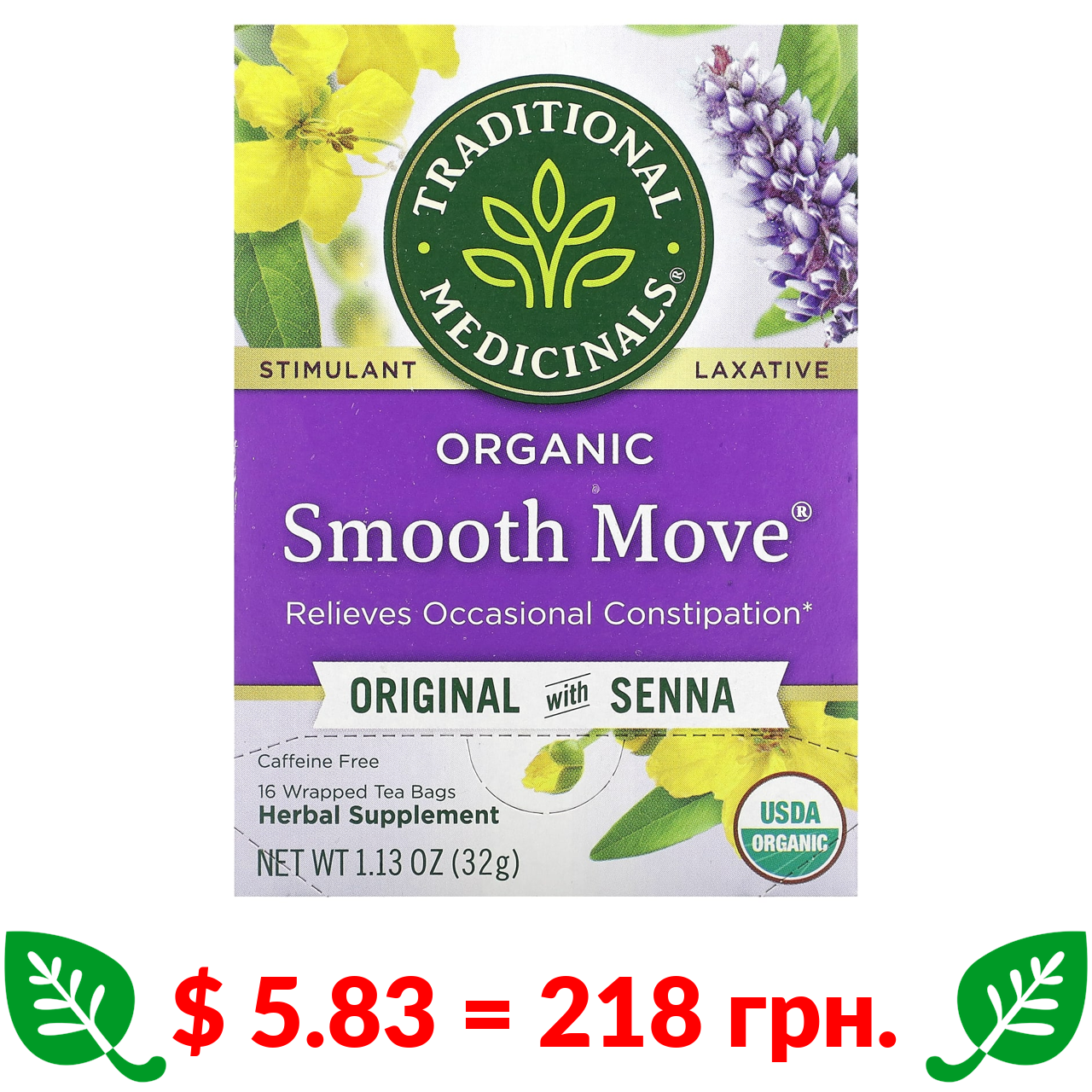 $ 5.83 = 218 грн. Traditional Medicinals, Smooth Move, органічний чай, класичний із сенною, без кофеїну, 16 чайних пакетиків в індивідуальній упаковці по 2 г (0,07 унції)