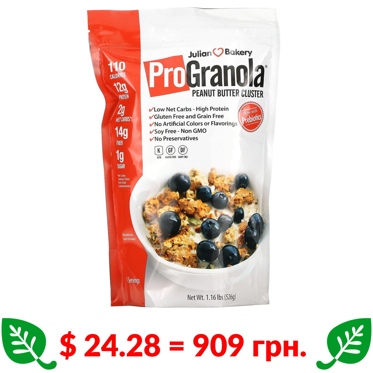 $ 24.28 = 909 грн. Julian Bakery, Pro Granola, гранола з арахісовим маслом, 526 г (1,16 фунта)