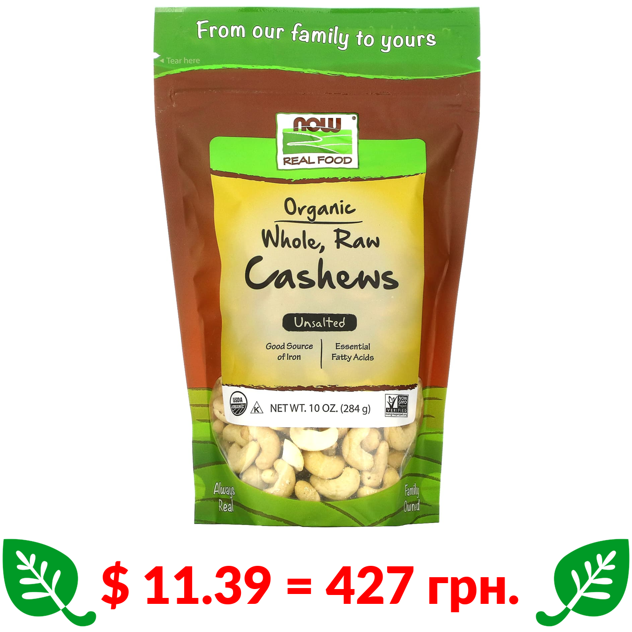 $ 11.39 = 427 грн. Now Foods, Real Food Organic, цілі, сирі горіхи кеш’ю, несолоні, 284 г (10 унцій)