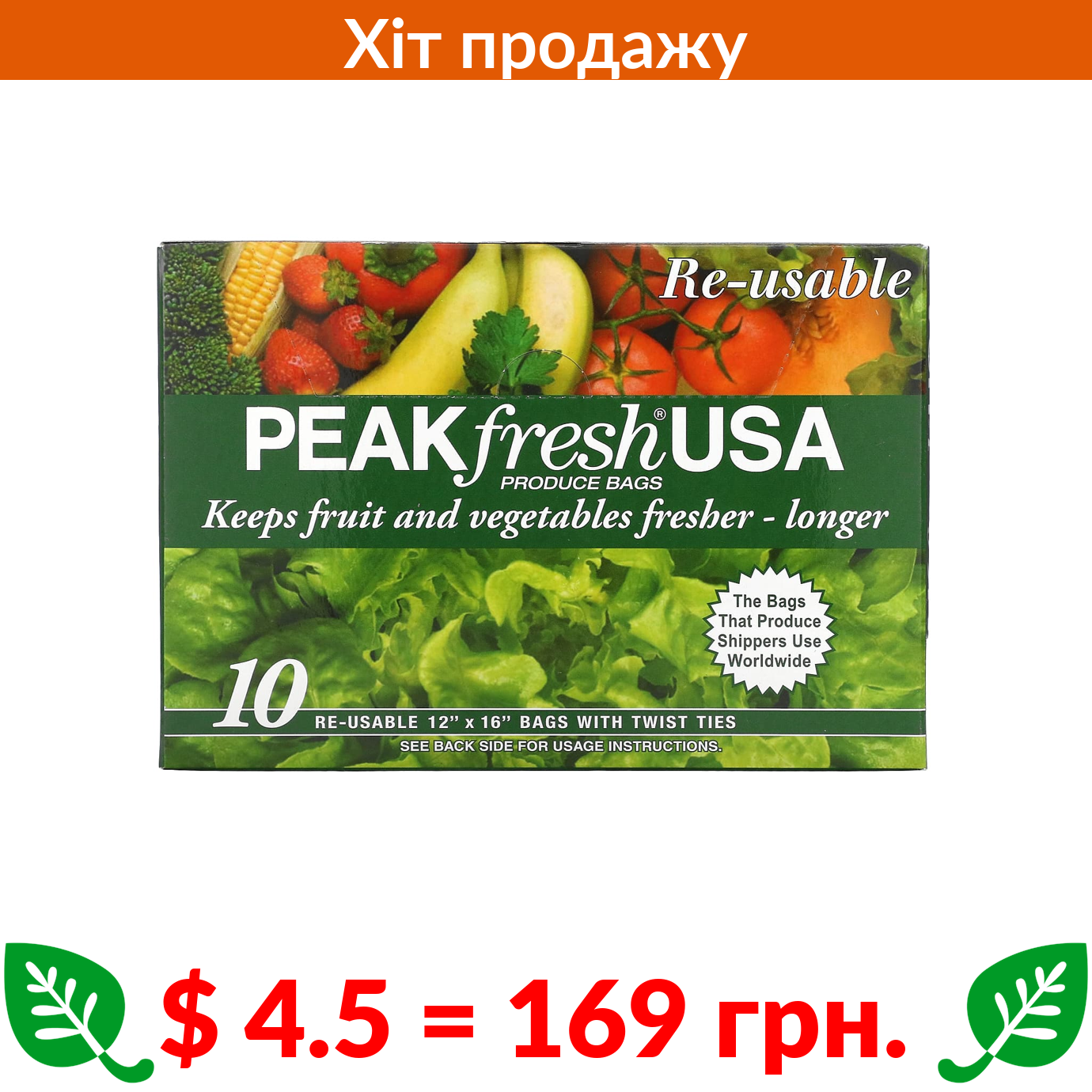 $ 4.5 = 169 грн. PEAKfresh USA, багаторазові пакети з затяжками для зберігання продуктів, 10 шт.