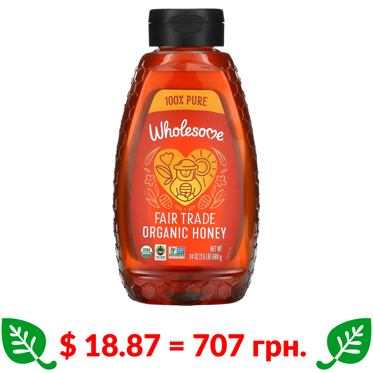 $ 18.87 = 707 грн. Wholesome, органічний мед, придбаний за принципами справедливої торгівлі, 680 г (24 унції)