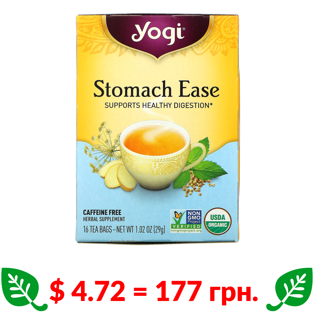 $ 4.72 = 177 грн. Yogi Tea, Stomach Ease, чай для полегшення травлення, 16 чайних пакетиків, 29 г (1,02 унції)