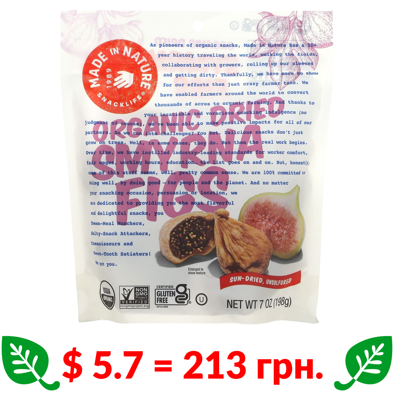 $ 5.7 = 213 грн. Made in Nature, органічний сушений інжир, м’які та привабливі суперснеки, 198 г (7 унцій)