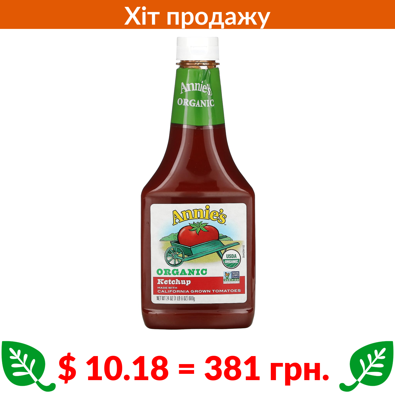 $ 10.18 = 381 грн. Annie’s Naturals, органічний кетчуп, 680 г (24 унції)
