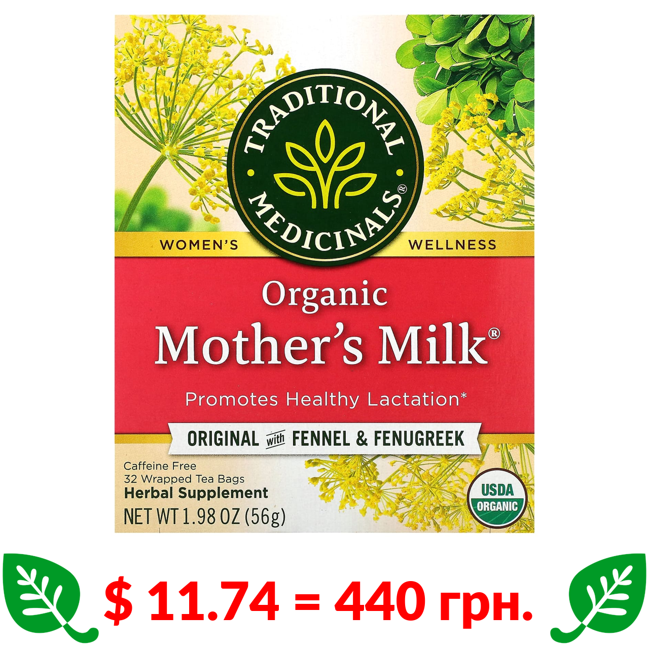 $ 5.82 = 218 грн. Traditional Medicinals, органічний фірмовий чай з фенхелем і пажитником, без кофеїну, 16 чайних пакетиків в упаковках, 28 г (0,99 унції)