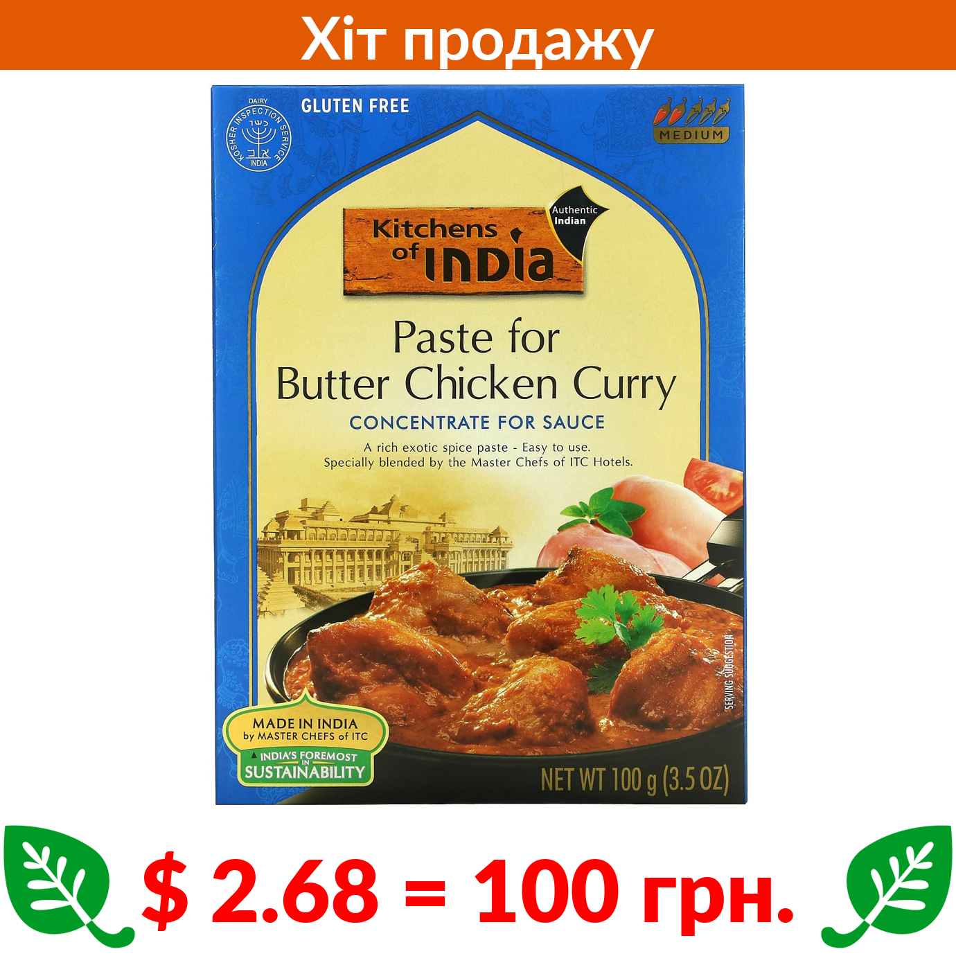 $ 2.68 = 100 грн. Kitchens of India, паста для приготування карі з курки у вершково-томатному соусі, концентрат для приготування соусу, негостра, 100 г (3,5 унції)