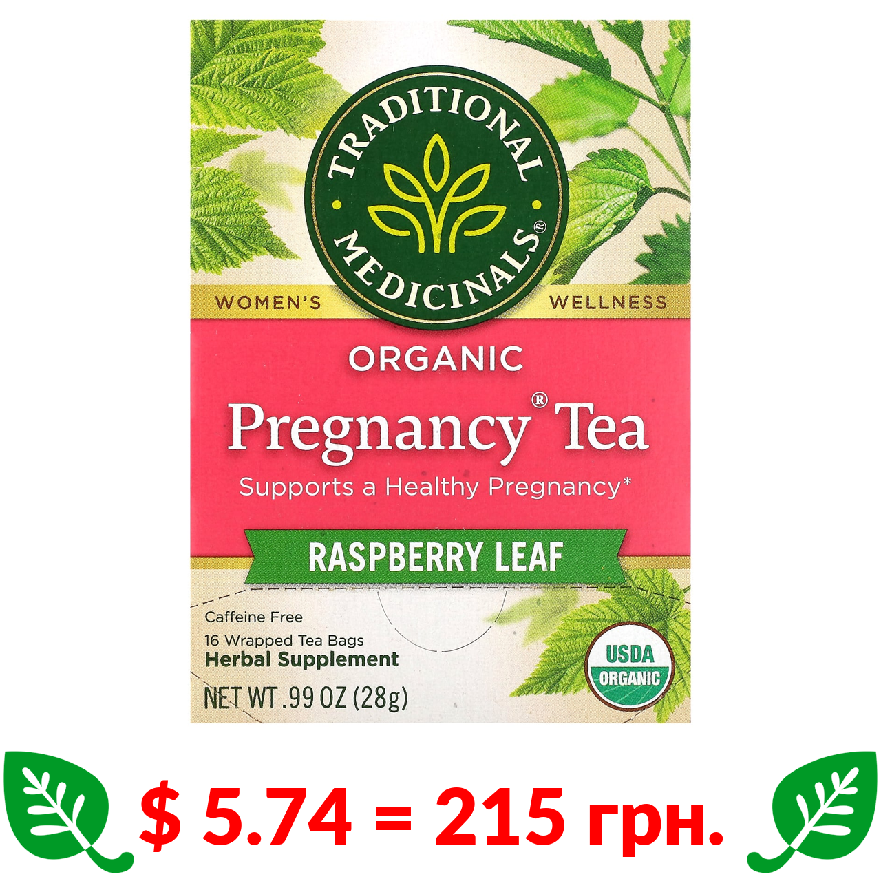 $ 5.74 = 215 грн. Traditional Medicinals, Organic Pregnancy Tea, Raspberry Leaf, Caffeine Free, 16 Wrapped Tea Bags, 0.06 oz (1.75 g) Each