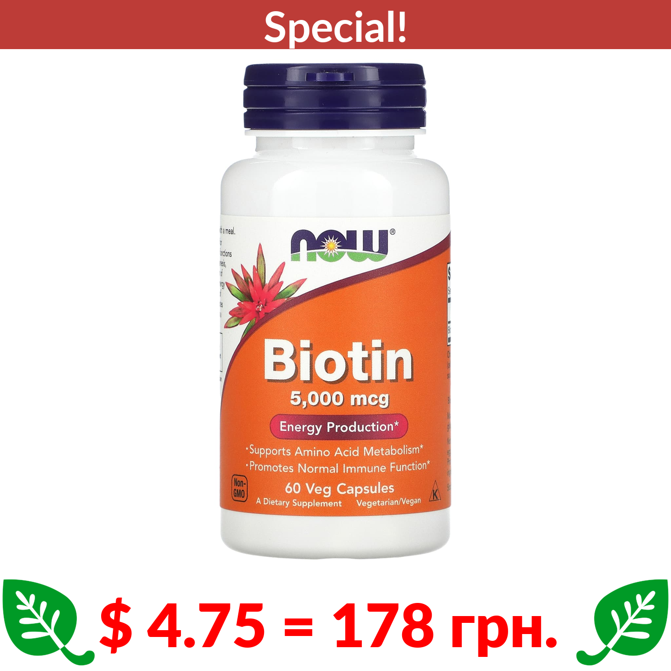 $ 4.75 = 178 грн. ???? cуперакція! ???? NOW Foods, Biotin, 5,000 mcg, 60 Veg Capsules
