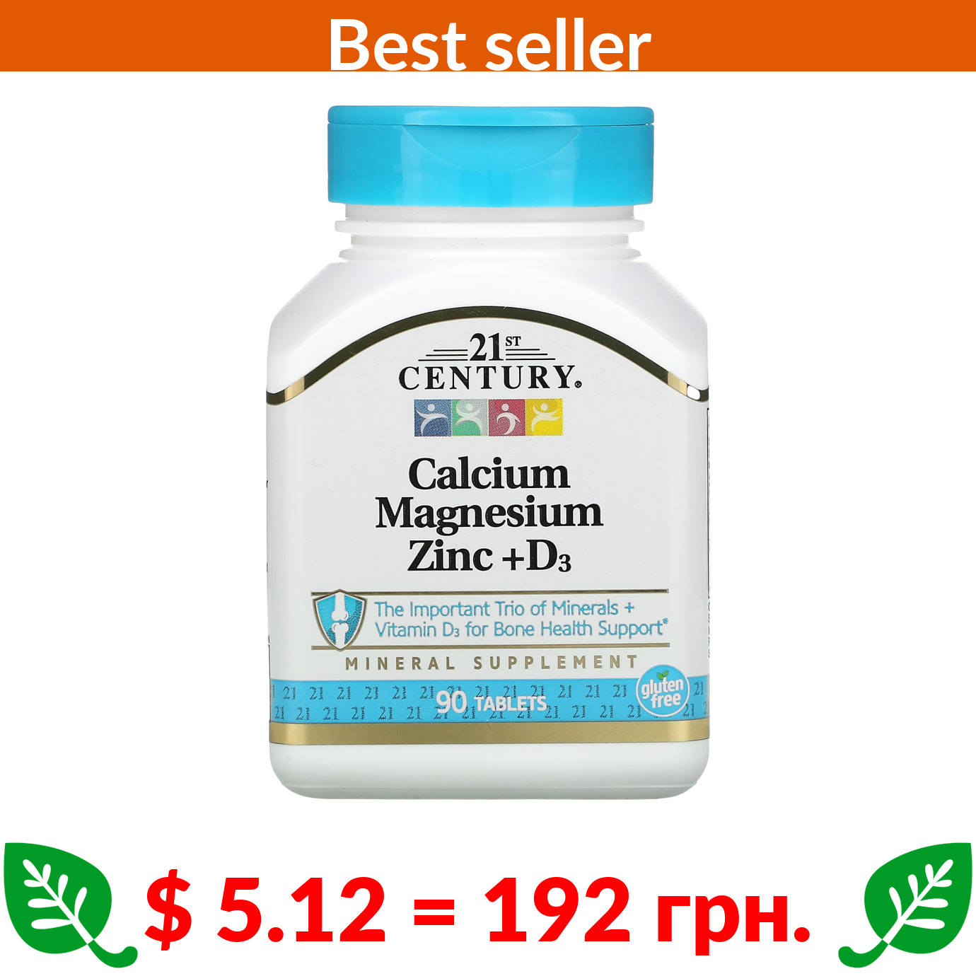 $ 5.12 = 192 грн. 21st Century, Calcium Magnesium Zinc + D3, 90 Tablets