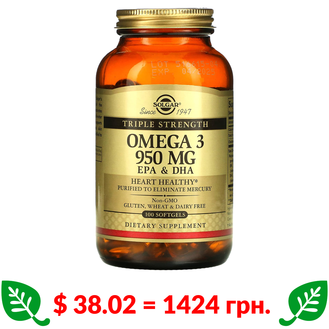 $ 38.02 = 1424 грн. Solgar, Omega 3, EPA & DHA, Triple Strength, 950 mg, 100 Softgels