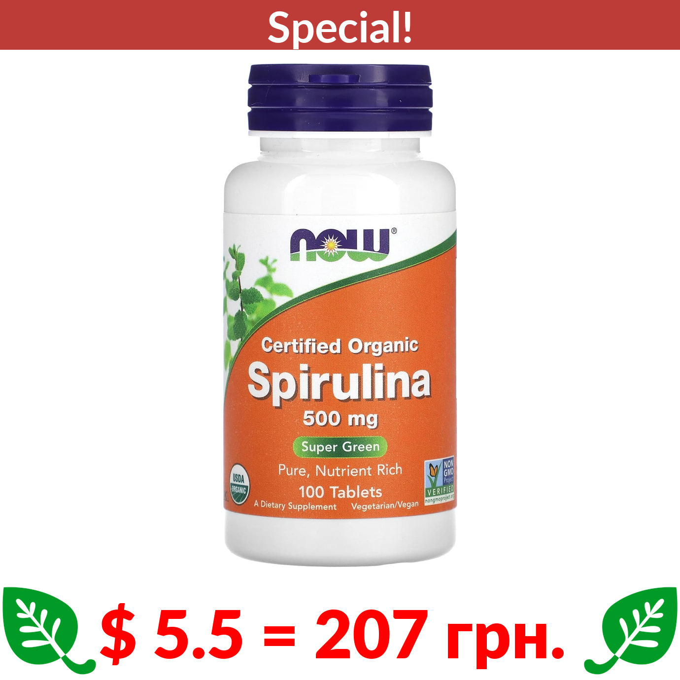 $ 5.5 = 207 грн. ???? cуперакція! ???? NOW Foods, Certified Organic Spirulina, 500 mg, 100 Tablets