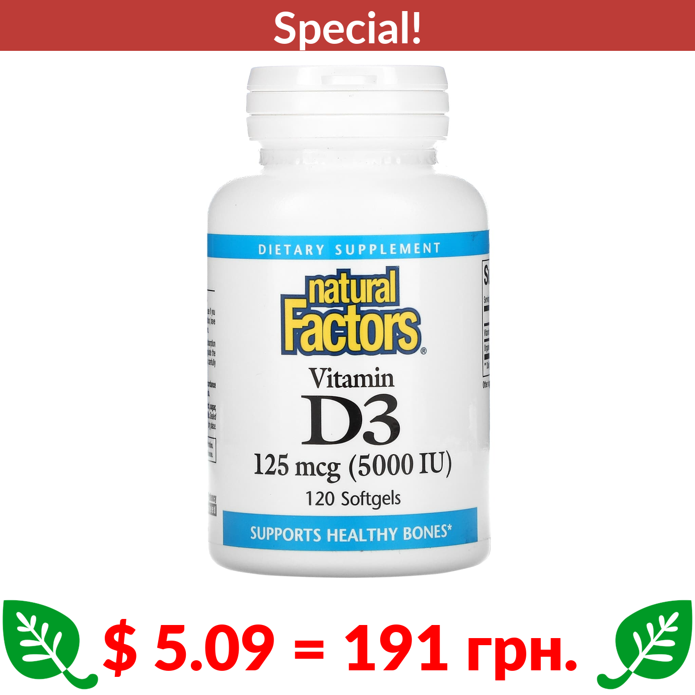 $ 5.09 = 191 грн. ???? cуперакція! ???? Natural Factors, Vitamin D3, 125 mcg (5,000 IU), 120 Softgels