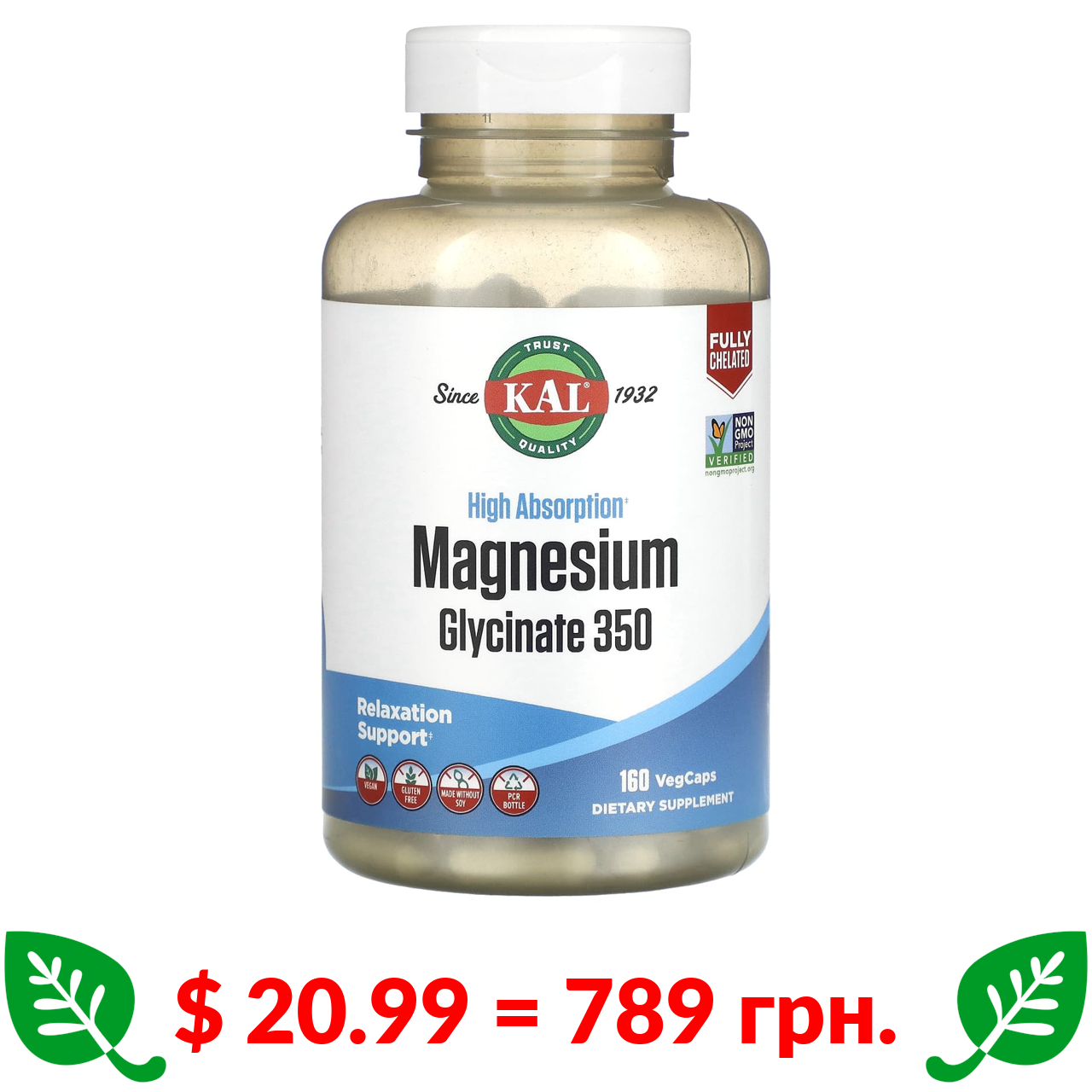 $ 20.99 = 789 грн. KAL, High Absorption Magnesium Glycinate 350, 160 VegCaps