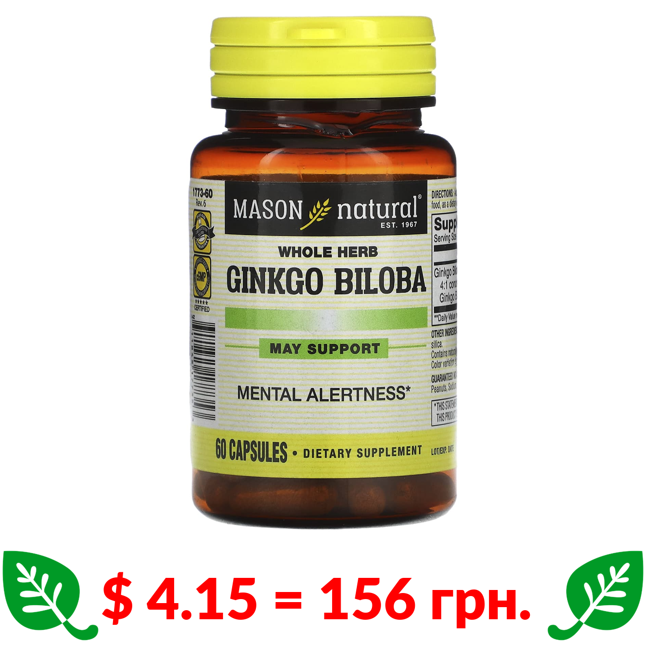 $ 4.15 = 156 грн. ????️ у кошику ????️ Mason Natural, Whole Herb Ginkgo Biloba, 60 Capsules