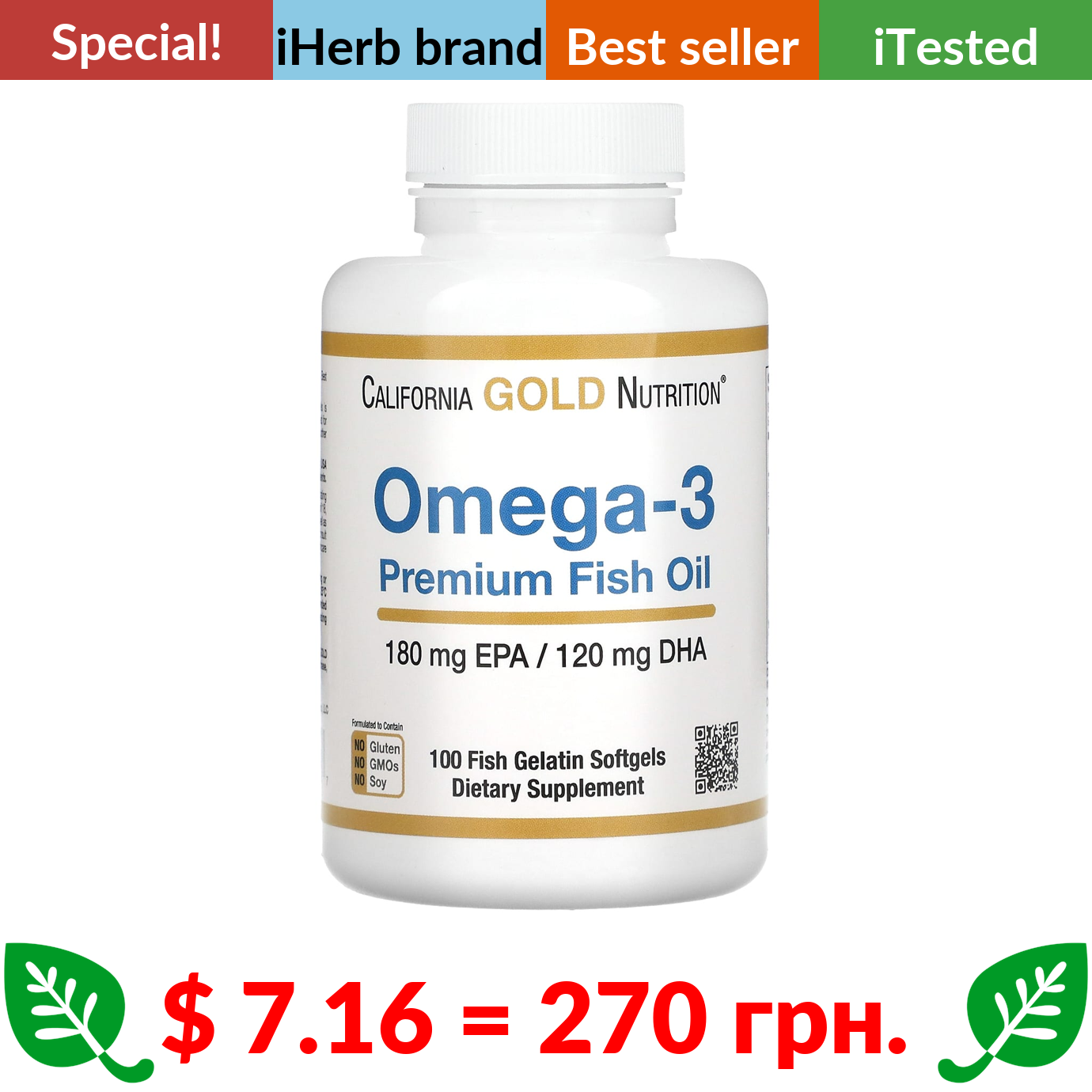 $ 7.16 = 270 грн. ???? cуперакція! ???? California Gold Nutrition, Omega-3 Premium Fish Oil, 2000 mg, 100 Fish Gelatin Softgels (180 EPA / 120 DHA per Softgel)