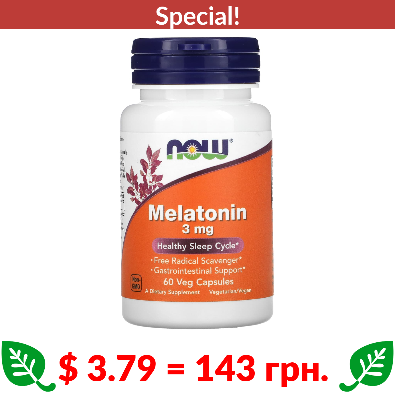 $ 3.79 = 143 грн. ???? cуперакція! ???? NOW Foods, Melatonin, 3 mg, 60 Veg Capsules