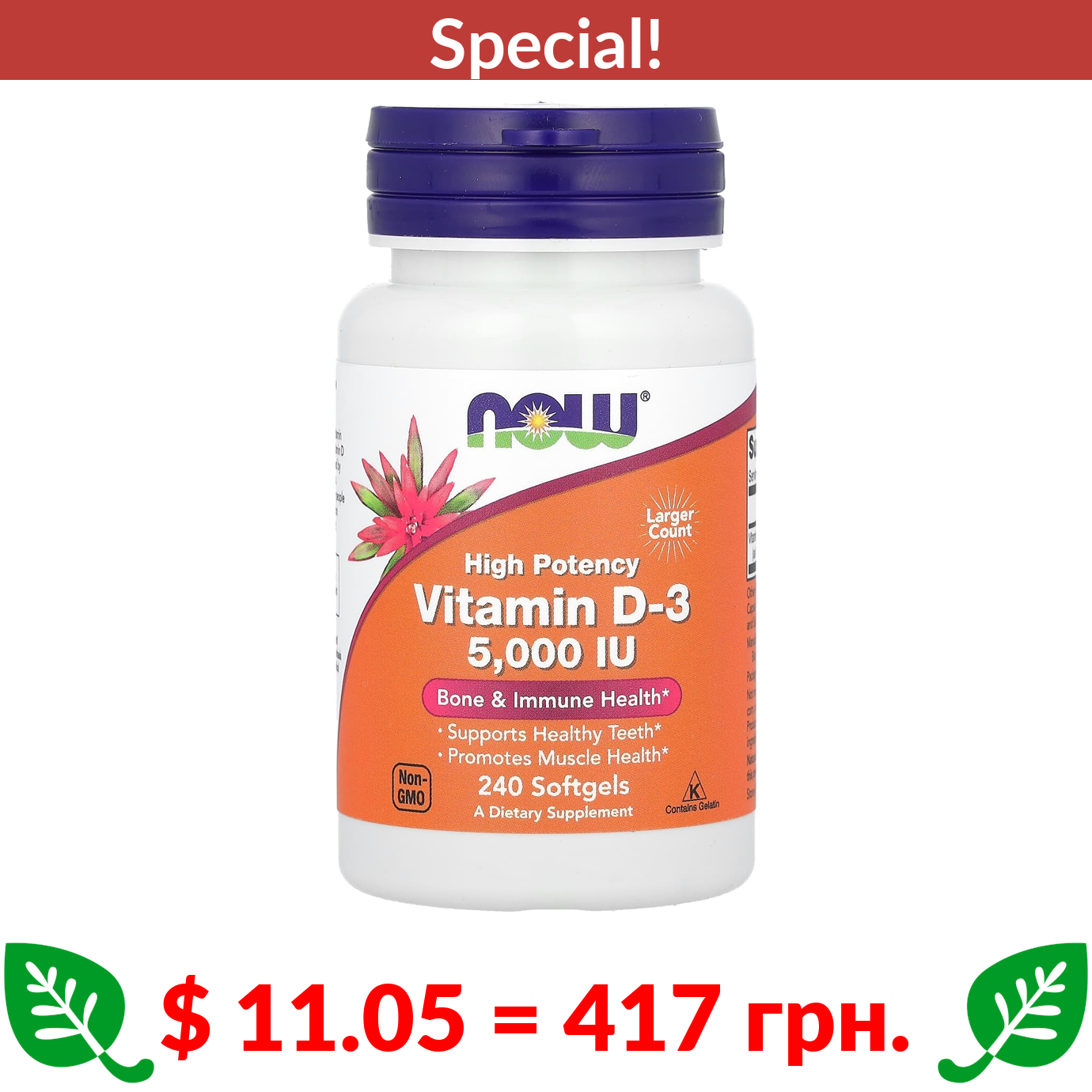 $ 11.05 = 417 грн. ???? cуперакція! ???? NOW Foods, Vitamin D-3, High Potency, 125 mcg (5,000 IU), 240 Softgels