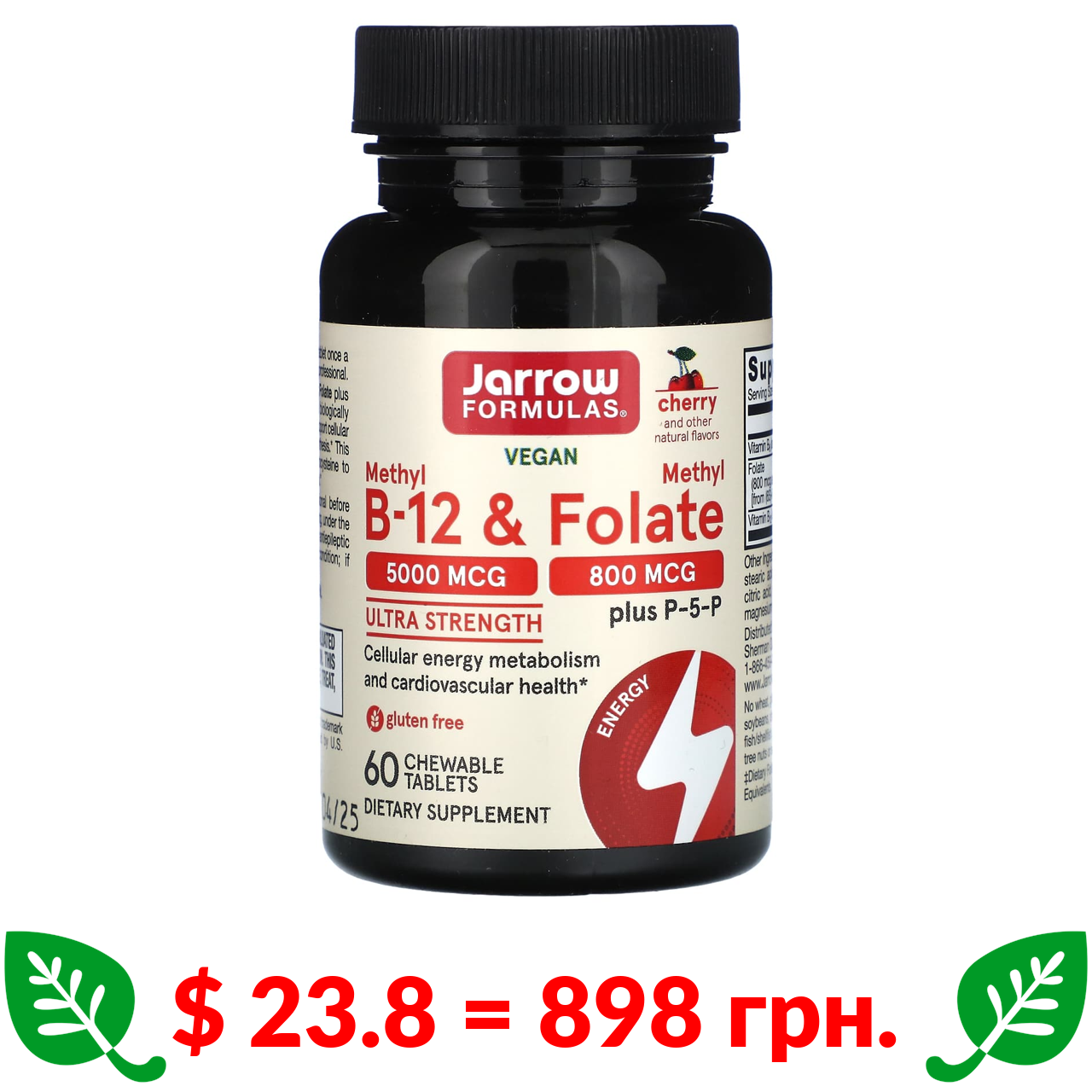 $ 23.8 = 898 грн. ????️ у кошику ????️ Jarrow Formulas, Vegan Methyl B-12 & Methyl Folate, Ultra Strength, Cherry, 60 Chewable Tablets