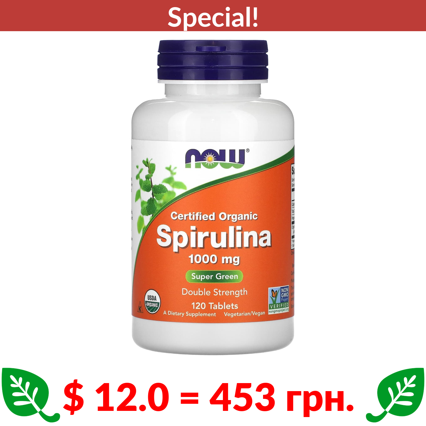 $ 12.0 = 453 грн. ???? cуперакція! ???? NOW Foods, Certified Organic Spirulina, Double Strength, 1,000 mg, 120 Tablets