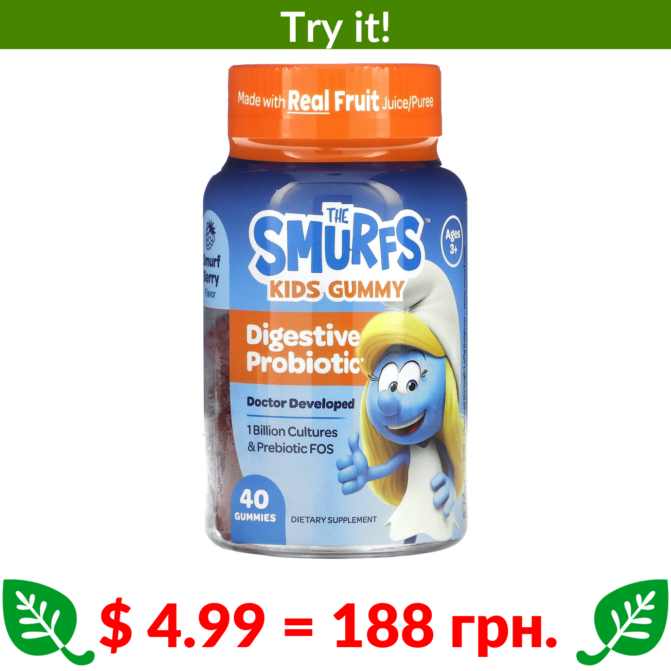 $ 4.99 = 188 грн. ???? варто спробувати ???? The Smurfs, Kids Gummy, Digestive Probiotic, Ages 3+, Smurf Berry, 40 Gummies