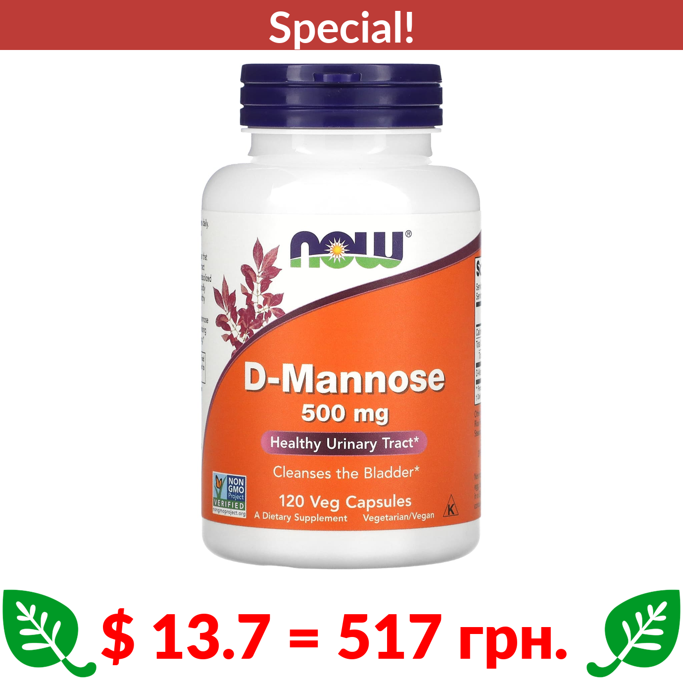 $ 13.7 = 517 грн. ???? cуперакція! ???? NOW Foods, D-Mannose, 500 mg, 120 Veg Capsules
