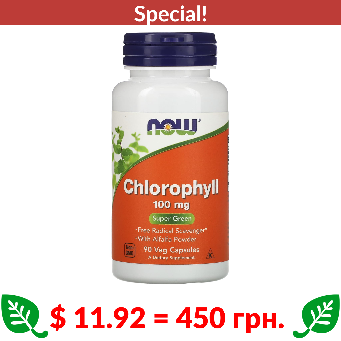$ 11.92 = 450 грн. ???? cуперакція! ???? NOW Foods, Chlorophyll, 100 mg, 90 Veg Capsules