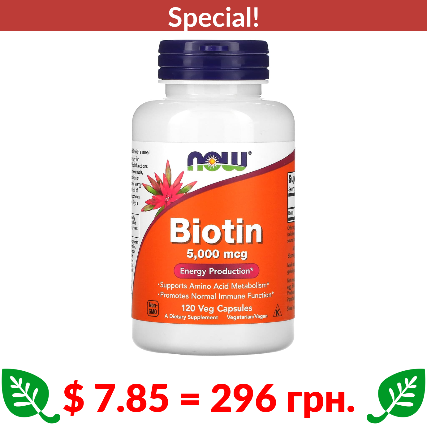 $ 7.85 = 296 грн. ???? cуперакція! ???? NOW Foods, Biotin, 5,000 mcg, 120 Veg Capsules