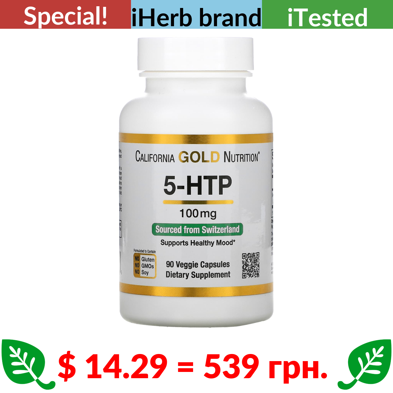 $ 14.29 = 539 грн. ???? cуперакція! ???? California Gold Nutrition, 5-HTP, Mood Support, Griffonia Simplicifolia Extract from Switzerland, 100 mg, 90 Veggie Capsules