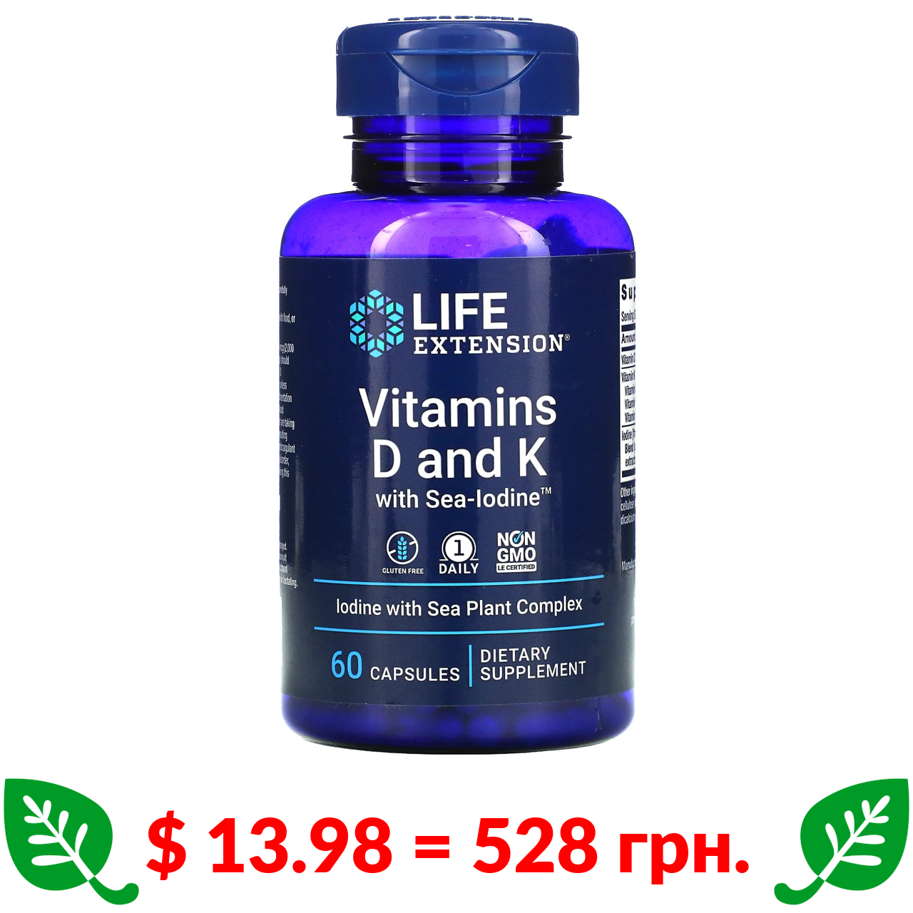 $ 13.98 = 528 грн. ????️ у кошику ????️ Life Extension, Vitamins D and K with Sea-Iodine, 60 Capsules