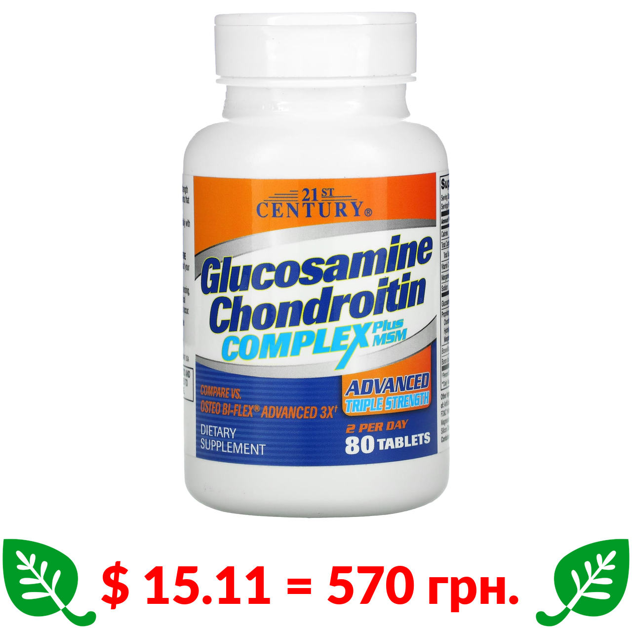 $ 15.11 = 570 грн. 21st Century, Glucosamine Chondroitin Complex Plus MSM, Advanced Triple Strength, 80 Tablets