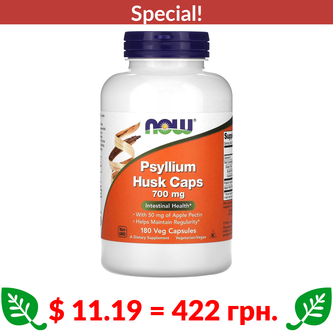 $ 11.19 = 422 грн. ???? cуперакція! ???? NOW Foods, Psyllium Husk Caps, 700 mg, 180 Veg Capsules