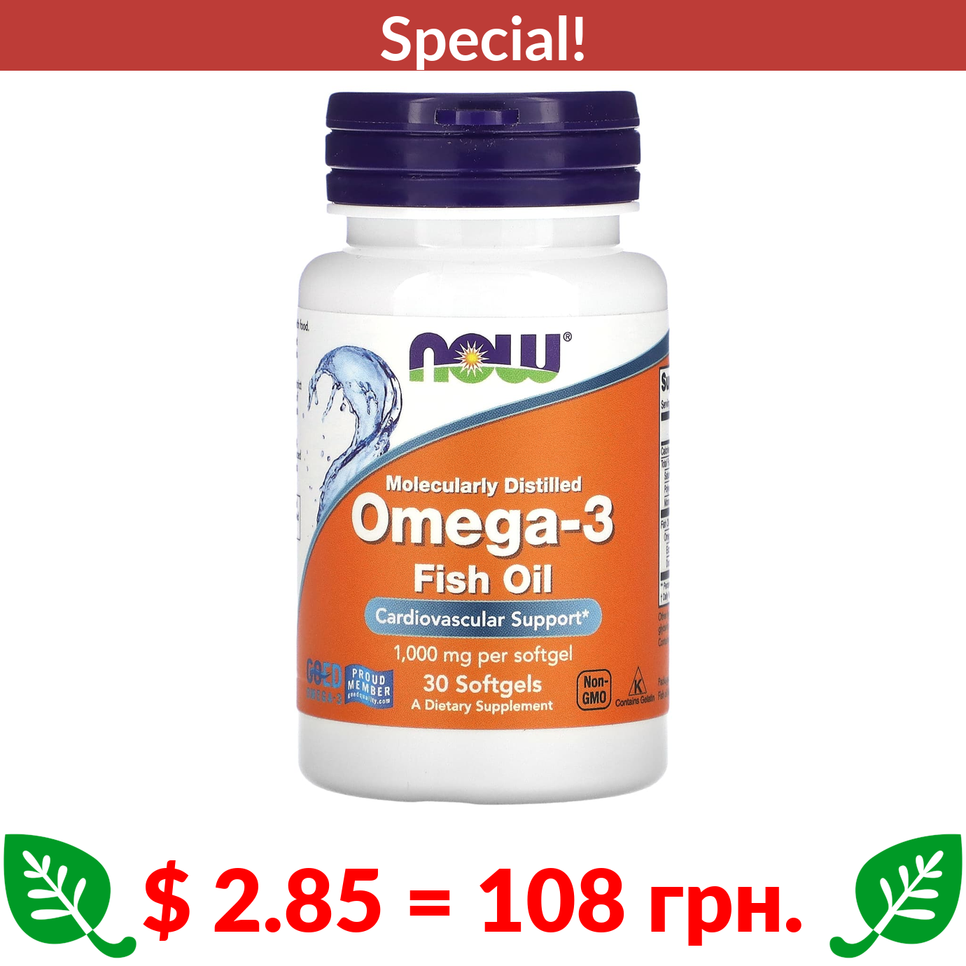 $ 2.85 = 108 грн. ???? cуперакція! ???? NOW Foods, Omega-3 Fish Oil, 1000 mg, 30 Softgels (1,000 mg per Softgel)