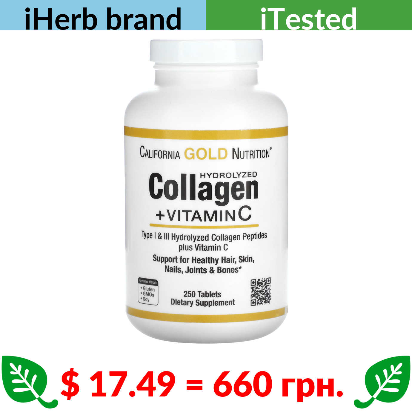 $ 17.49 = 660 грн. ????️ у кошику ????️ California Gold Nutrition, Hydrolyzed Collagen Peptides + Vitamin C, Type I & III, 250 Tablets